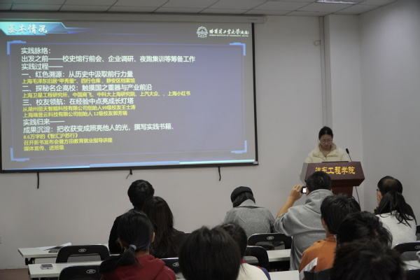 在经验分享环节,往届优秀实践代表李亦非围绕“前期准备、实践过程、总结复盘、新闻宣传、报告撰写”五大核心模块,系统分享了社会实践的全流程实操经验。他强调,实践前期要立足专业特色、贴合时代需求确定主题,通过互补搭配组建团队、细化方案备足物资;实践过程中要沉下心调研,善用开放提问、双轨记录等方法获取真实素材,灵活应对突发情况;后期要注重成果转化,通过分类梳理素材、量化实践成果、构建叙事闭环,让实践价值最大化。另一位优秀实践代表胡依佳则以“智汇沪航”实践队的经历为例,分享了红色溯源、名企探访、校友领航相结合的实践模式。她详细介绍了实践队如何通过校史馆行前会凝聚精神力量,走进上海毛泽东旧居、四行仓库等红色基地汲取奋进动力,探访中国商飞、上汽大众等知名企业触摸产业前沿,对话优秀校友获取成长启示,最终沉淀出8.6万字的《智汇沪苏行》实践书籍的宝贵历程,为在场队员提供了可借鉴的实践范本。